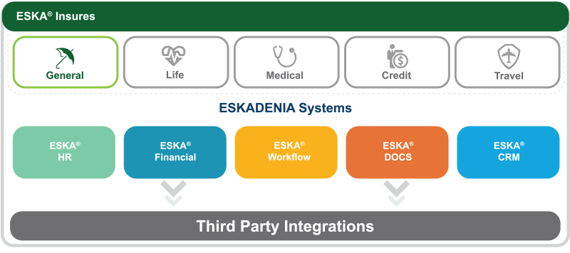 ESKA® General is a powerful digital system geared to strengthen every dimension of general insurance. Providing class-specific functions for insurance classes spanning motor, property, general accident, cargo & hull, engineering and aviation, ESKA General empowers you to craft and continuously refine a robust insurance enterprise for the twenty first century.
